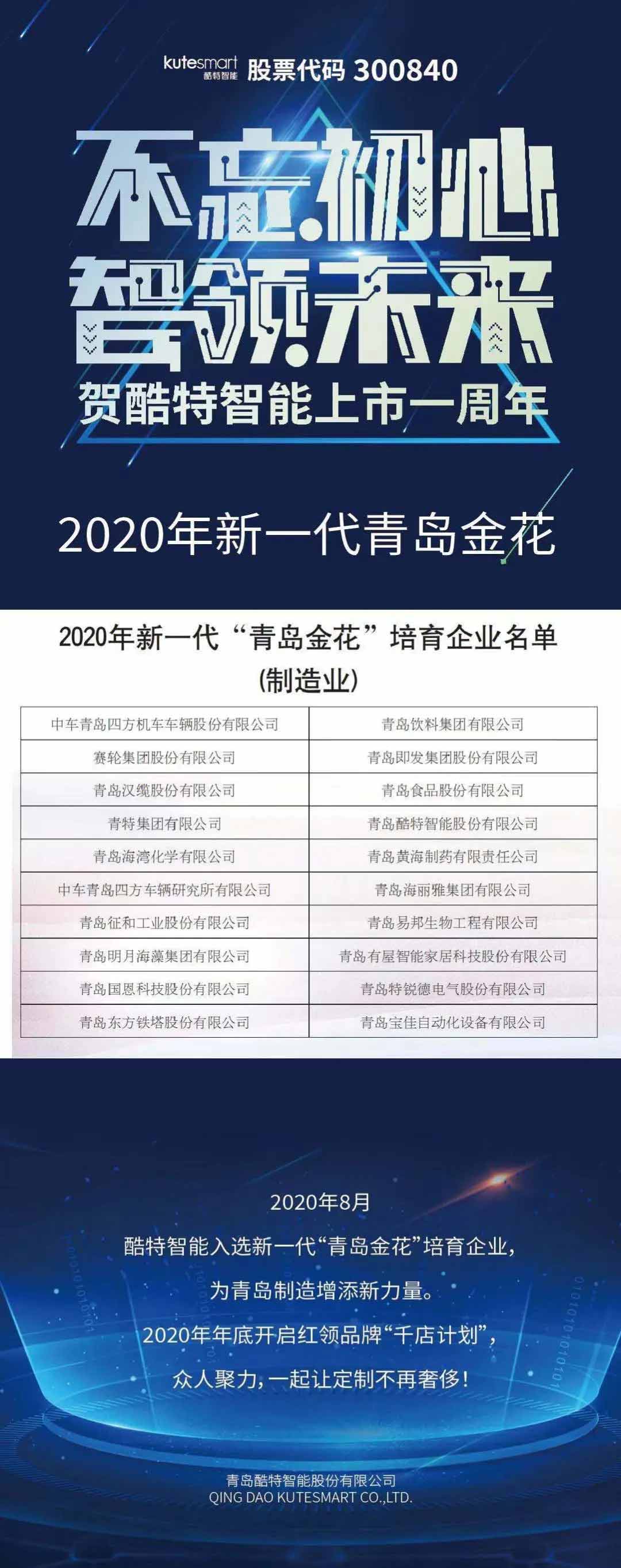 2020年8月,青島市工信局、市發(fā)改委、市農(nóng)業(yè)農(nóng)村局聯(lián)合發(fā)布了《2020年新一代“青島金花”培育企業(yè)名單》,其中,酷特智能作為中國產(chǎn)業(yè)互聯(lián)網(wǎng)時(shí)代上市企業(yè)躋身榜中,為青島制造增添新的力量。