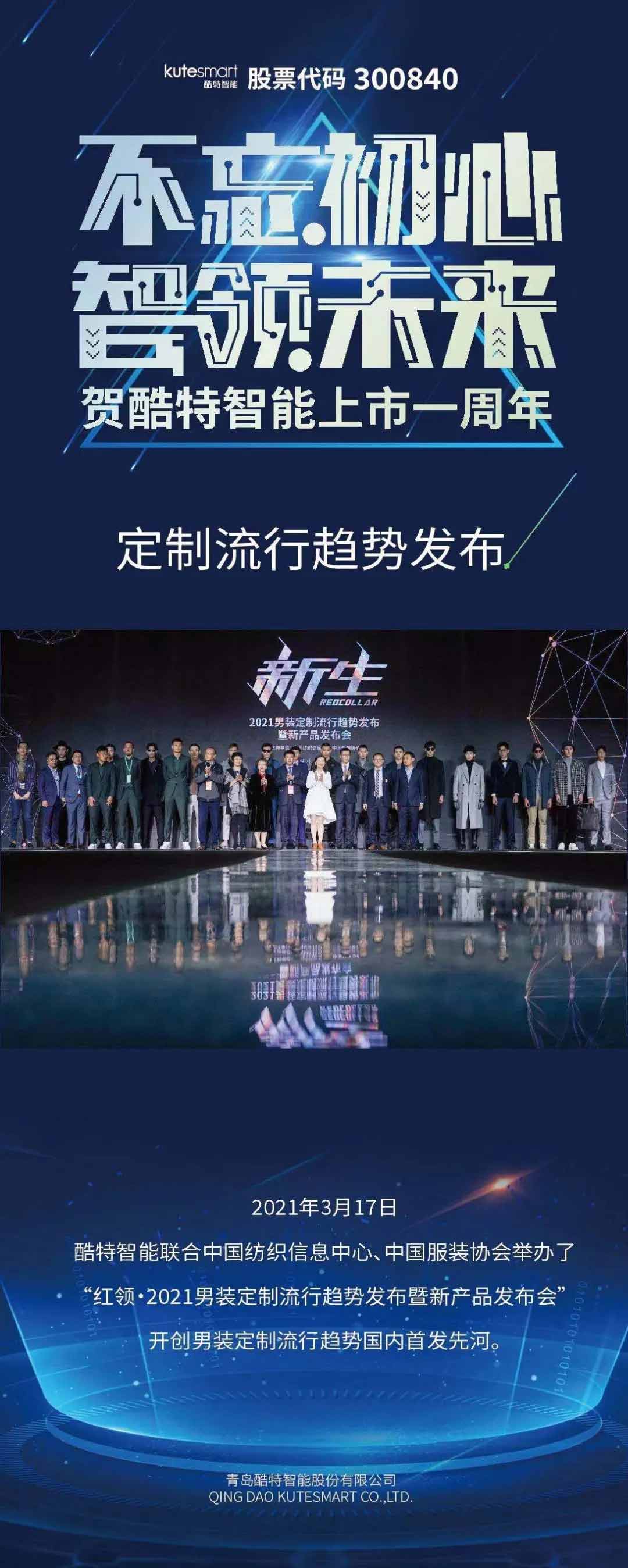2021年3月17日,酷特智能旗下時(shí)尚定制品牌“紅領(lǐng)REDCOLLAR”聯(lián)合中國紡織信息中心、中國服裝協(xié)會在上海國家會展中心共同舉辦了“紅領(lǐng)·2021男裝定制流行趨勢發(fā)布暨新產(chǎn)品發(fā)布會”,開啟品牌“新生”?!凹t領(lǐng)REDCOLLAR”以全新設(shè)計(jì)理念詮釋了男裝定制的含義,同時(shí),開創(chuàng)了男裝定制流行趨勢國內(nèi)首發(fā)先河。