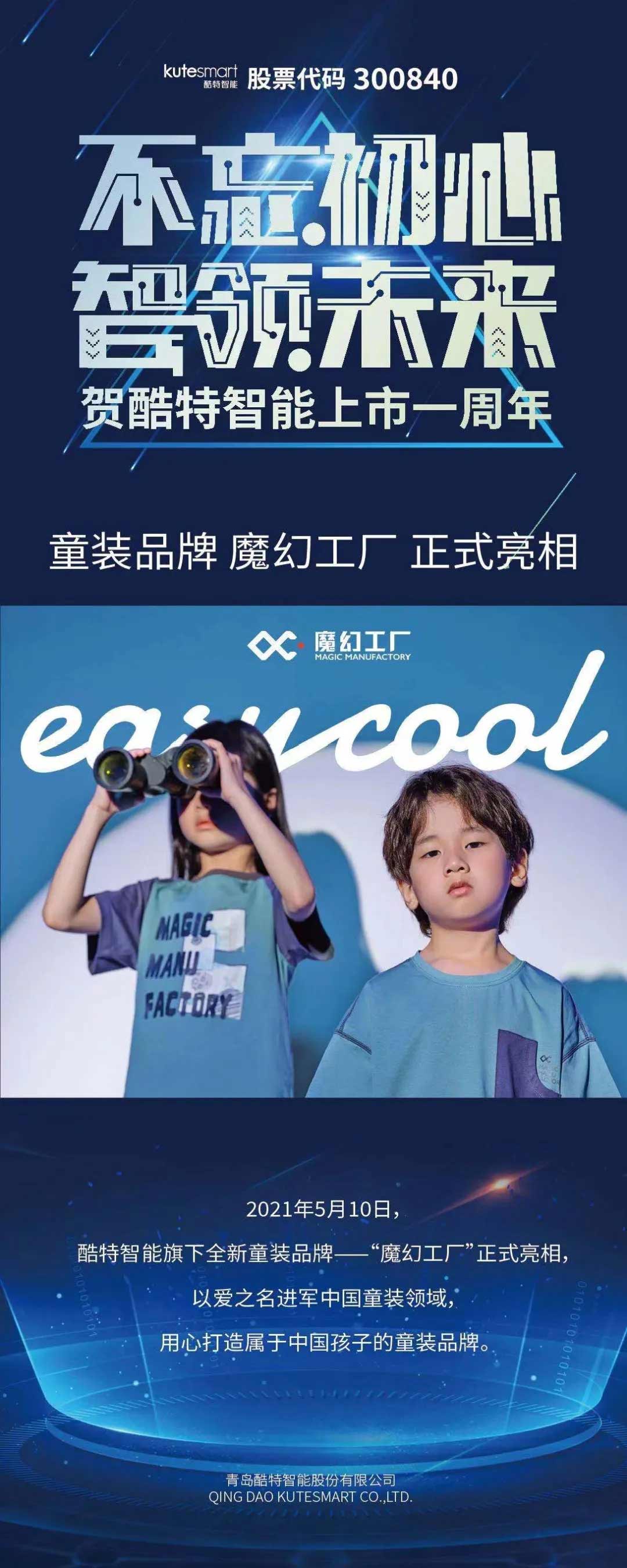 2021年5月10日,酷特智能全新童裝品牌——“魔幻工廠”正式亮相,以愛之名進(jìn)軍中國童裝領(lǐng)域,用心打造屬于中國孩子的童裝品牌。這是酷特智能C2M產(chǎn)業(yè)互聯(lián)網(wǎng)生態(tài)布局的一個(gè)新起點(diǎn),也是酷特智能積極響應(yīng)政府號召,通過打造C2M產(chǎn)業(yè)互聯(lián)網(wǎng)平臺助力自身及其他企業(yè)結(jié)出的又一碩果。