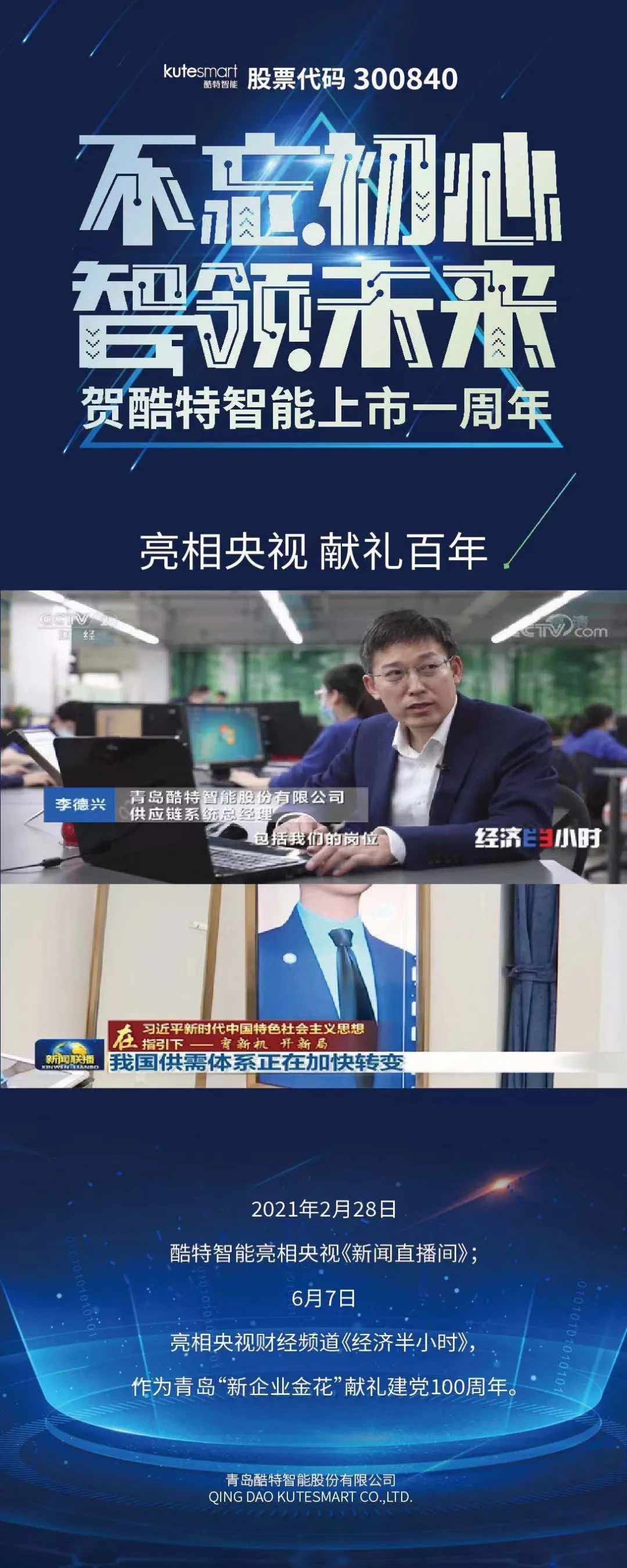 2021年2月28日,酷特智能亮相央視《新聞直播間》欄目,在慶祝中國共產(chǎn)黨成立100周年系列報(bào)道——《奮斗百年路 啟航新征程》中,開篇便介紹了酷特智能新增轉(zhuǎn)產(chǎn)的醫(yī)療健康版塊,作為青島“新企業(yè)金花”獻(xiàn)禮建黨100周年。