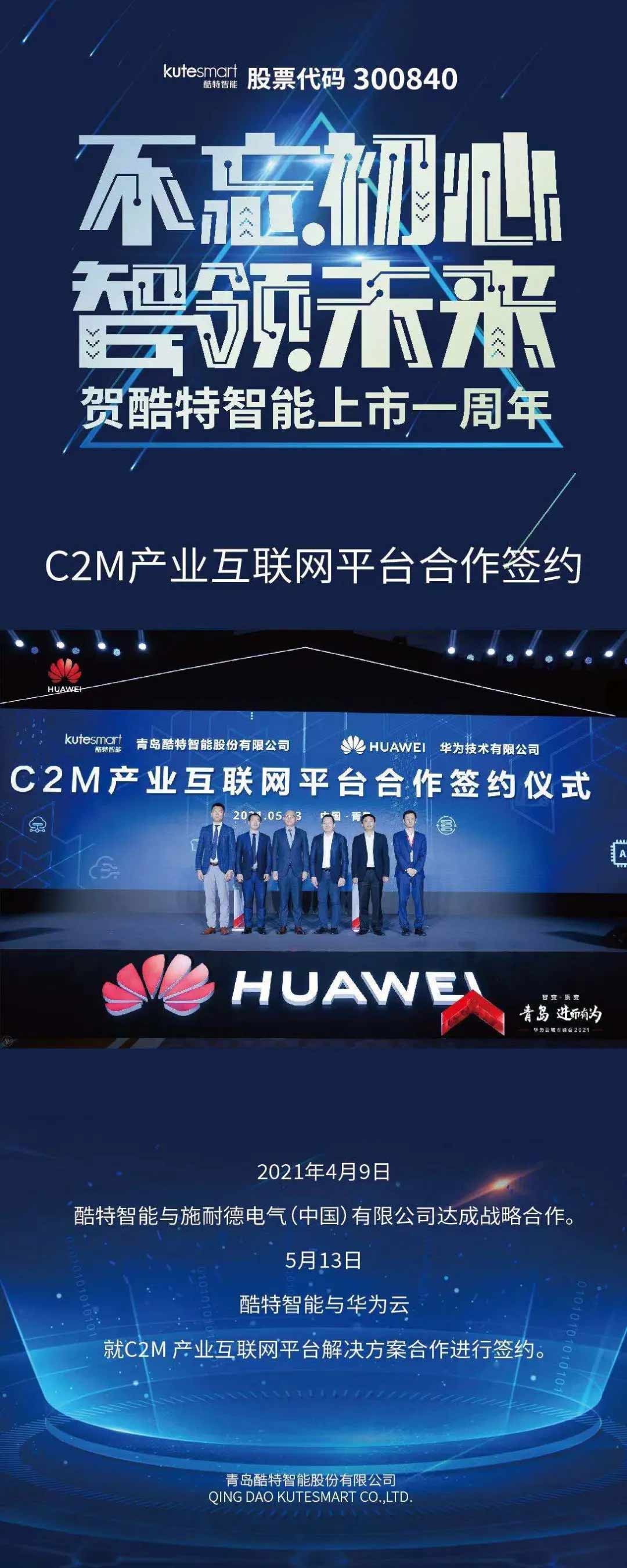 2021年5月13日,酷特智能與華為云就C2M產(chǎn)業(yè)互聯(lián)網(wǎng)平臺解決方案合作進(jìn)行簽約。雙方將共同打造國內(nèi)一流的C2M產(chǎn)業(yè)互聯(lián)網(wǎng)平臺解決方案,聯(lián)合拓展智能制造市場與大企業(yè)云服務(wù)市場,為政府客戶和大企業(yè)客戶提供一站式解決方案??崽刂悄芎腿A為云的強(qiáng)強(qiáng)聯(lián)合為C2M產(chǎn)業(yè)互聯(lián)網(wǎng)發(fā)展注入新力量,推動(dòng)傳統(tǒng)制造業(yè)實(shí)現(xiàn)跨越式發(fā)展,助力打造青島“世界工業(yè)互聯(lián)網(wǎng)之都”。