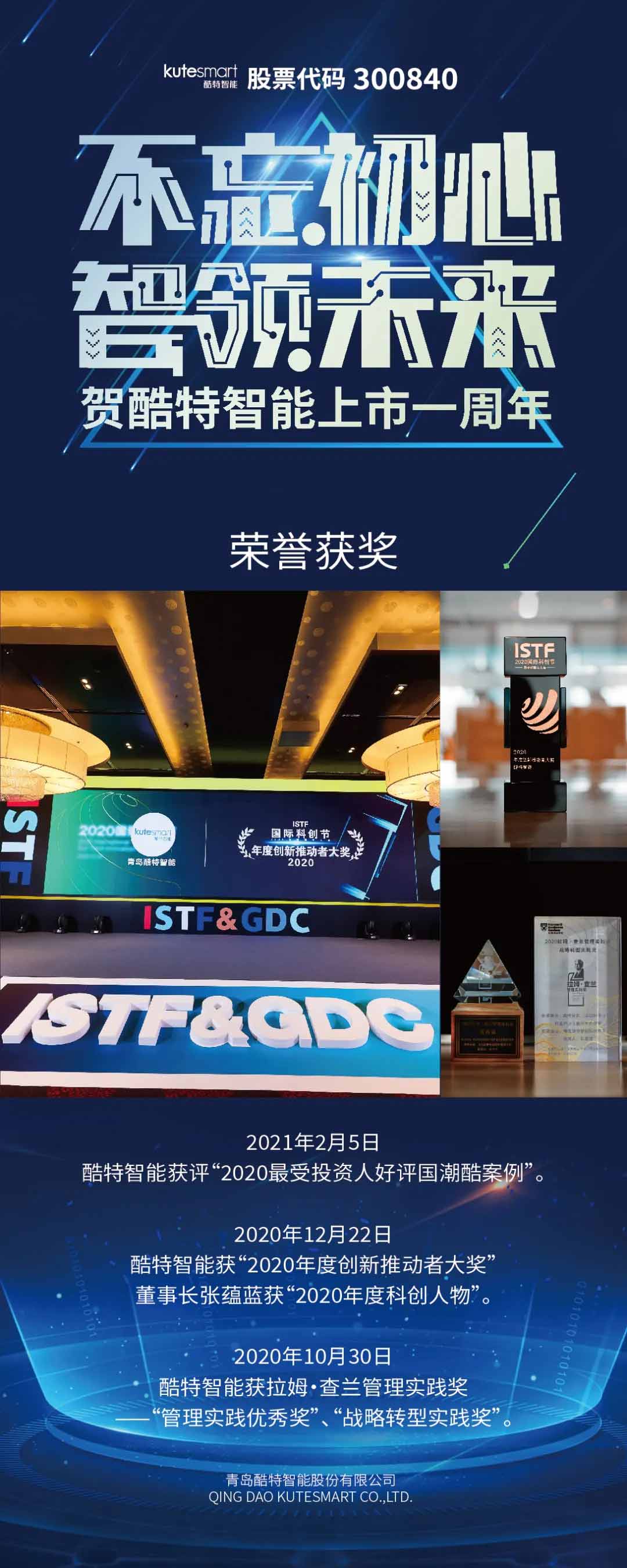 2021年2月5日,中國領(lǐng)先記者工作平臺鯨平臺,聯(lián)合國際數(shù)字商業(yè)創(chuàng)新大獎(jiǎng)ECI在線上舉行了“2021鯨潮論壇暨首屆鯨潮獎(jiǎng)榜單發(fā)布儀式”。其中,酷特智能獲評“2020最受投資人好評國潮酷案例”。