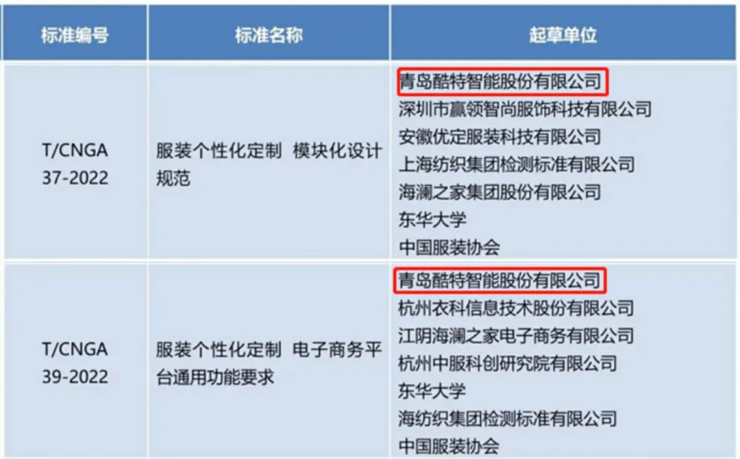 為推動(dòng)我國(guó)服裝領(lǐng)域新型標(biāo)準(zhǔn)體系建設(shè),進(jìn)一步加強(qiáng)標(biāo)準(zhǔn)對(duì)行業(yè)發(fā)展的支撐和引領(lǐng)作用,促進(jìn)服裝領(lǐng)域的技術(shù)創(chuàng)新,滿(mǎn)足市場(chǎng)和行業(yè)發(fā)展需求,酷特智能依據(jù)《中國(guó)服裝協(xié)會(huì)團(tuán)體標(biāo)準(zhǔn)管理辦法》,以提高產(chǎn)業(yè)競(jìng)爭(zhēng)力、加快科技成果轉(zhuǎn)化為目標(biāo),以促進(jìn)行業(yè)規(guī)范發(fā)展、圍繞行業(yè)發(fā)展迫切需要和參與國(guó)內(nèi)外市場(chǎng)競(jìng)爭(zhēng)為主要方向,參與起草了本次發(fā)布的兩項(xiàng)CNGA標(biāo)準(zhǔn)。