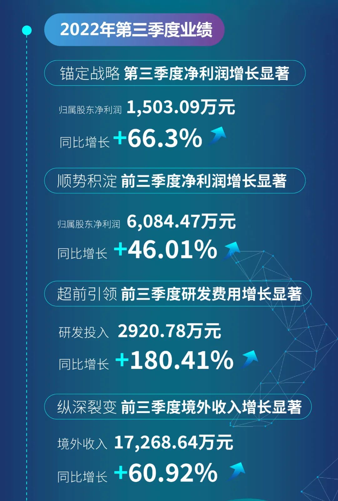 10月28日,“優(yōu)等生”代表、國(guó)內(nèi)服裝智能定制賽道的領(lǐng)軍企業(yè)酷特智能發(fā)布的2022年三季度報(bào)告顯示:第三季度歸屬于上市公司股東的凈利潤(rùn)1503.09萬(wàn)元,同比增長(zhǎng)66.3%;放眼前三季度,在營(yíng)業(yè)收入較同期穩(wěn)步增長(zhǎng)5.22%的基礎(chǔ)上,歸屬于上市公司股東的凈利潤(rùn)高達(dá)6084.47萬(wàn)元,同比增長(zhǎng)46.01%。這其中,境外收入表現(xiàn)搶眼,前三季度實(shí)現(xiàn)17268.64萬(wàn)元,同比增長(zhǎng)60.92%。