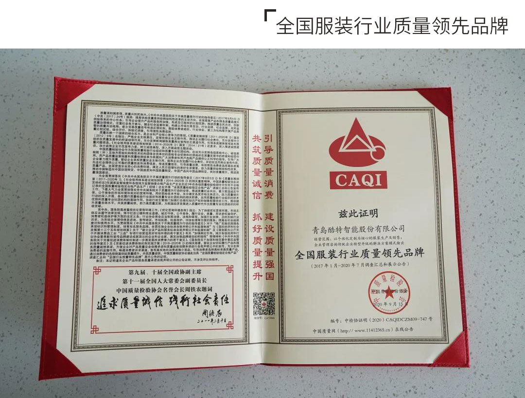 2020年全國“質(zhì)量月”活動,以“建設(shè)質(zhì)量強(qiáng)國 決勝全面小康”為主題,酷特智能致力于打造有益于社會文明進(jìn)步的百年企業(yè),以智造品質(zhì)產(chǎn)品,履行社會責(zé)任為己任積極響應(yīng)全國“質(zhì)量月”號召,牢固樹立“質(zhì)量第一”的品牌生產(chǎn)意識,不斷健全質(zhì)量管理規(guī)范,提升質(zhì)量管控水平,能夠被認(rèn)定為“全國服裝行業(yè)質(zhì)量領(lǐng)先品牌”,是消費(fèi)者對酷特智能產(chǎn)品質(zhì)量的肯定,同時(shí)也是一份鞭策和責(zé)任。