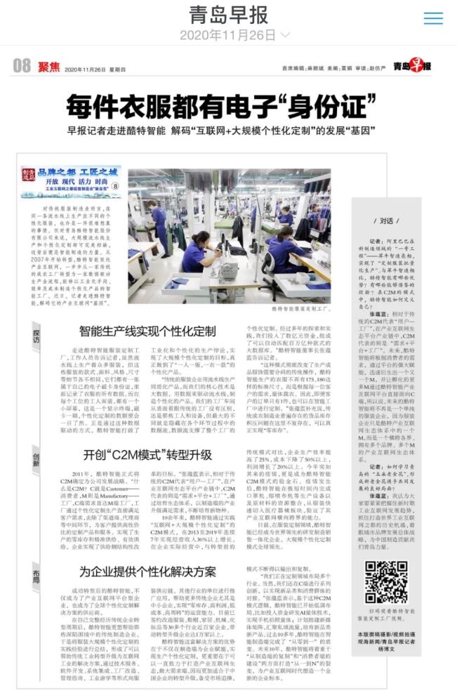 “我們正在定制領域布局多個行業(yè)。當然,我們還在C端進行系列創(chuàng)新,以實現(xiàn)新品類和消費群體的對接?!睆?zhí)N藍表示,基于這種C2M模式邏輯,紅領已開始低調(diào)布局,比如投入資金研發(fā)AI量體技術(shù),實現(xiàn)手機拍照量體;計劃組建新媒體矩陣,匯聚私域流量,培育新品類新產(chǎn)品。過去10多年,紅領在智能制造端完成了 “從零到一”的質(zhì)變。未來10年,紅領將著重于“從制造端的復制”和“消費者端的建設”兩方面打造“從一到N”的裂變,為產(chǎn)業(yè)互聯(lián)網(wǎng)時代塑造一個全新的企業(yè)標本。